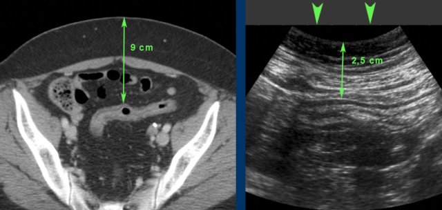 CT of an obese patient with inactive ulcerative colitis. The sigmoid lies 9 cms from the skin.