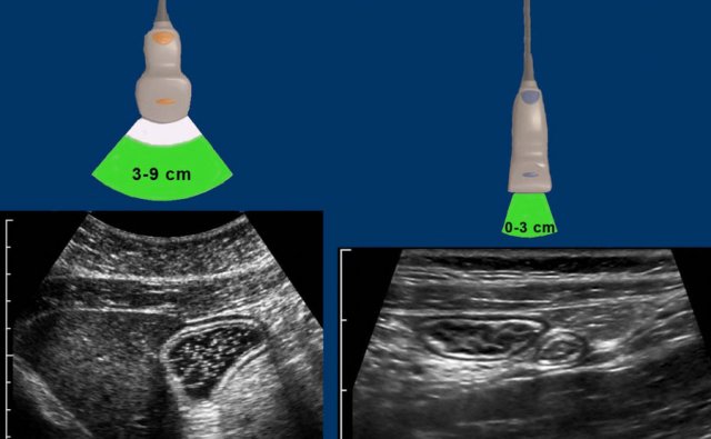 Choice of the probe is based on the depth where the bowel is visualized during compression.