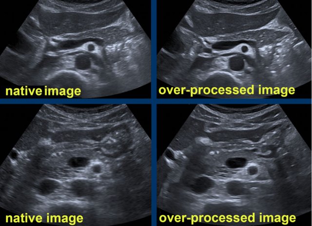 Compare the native US images (left) of the pancreatic region with the strongly processed US images (right).