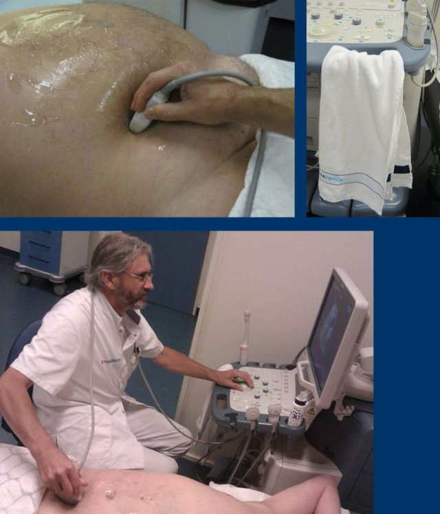 It is very important to keep the fingers of the probe-hand free of US gel: the combination of rather forceful compression with subtle rotational movements requires a dry hand.