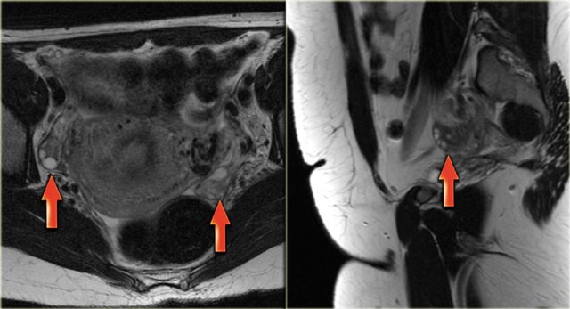 In the coronal T2-weighted image of a postmenopausal woman the ovary is no more than a dark tissue clump near the proximal end of the round ligament.