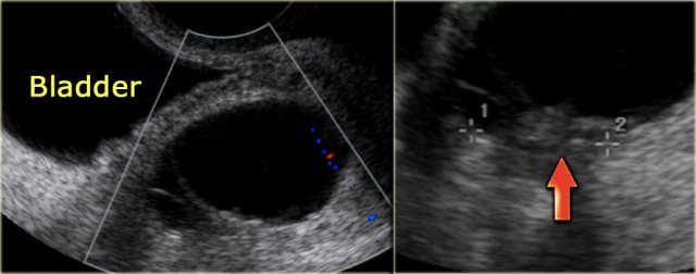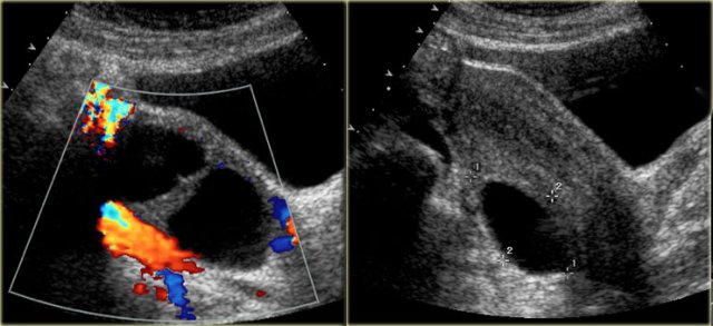 There is, however, a nodule on the posterior wall that shows no flow on Doppler.