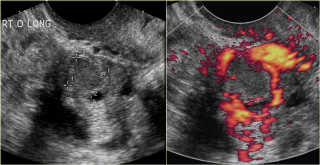 The transvaginal ultrasound images show a small complex ovarian cyst with wall vascularity on power Doppler analysis.