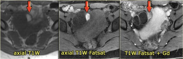 After the administration of Gd there is no enhancement, confirming that this is a hemorrhagic ovarian cyst.