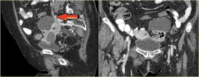 CT of the same patient shows a multi-loculated cystic mass adjacent to the bladder, connected to the left ovarian vein (arrow).