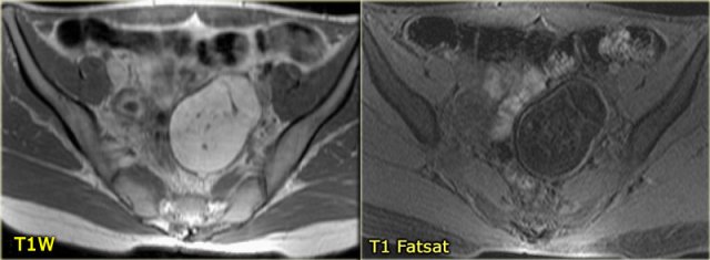 In an image with overall reasonably good fat suppression this rules out a fat-containing teratoma and confirms the suggestion of hemorrhagic fluid.