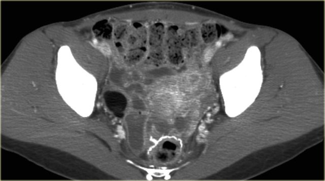 There is no ascites orperitoneal deposits and no lymphadenopathy.