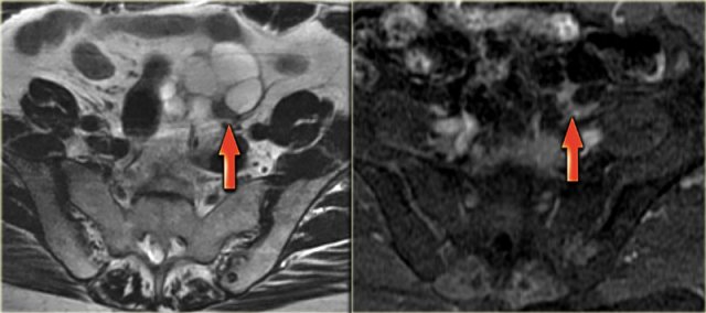 LEFT: Postmenopausal woman. The ovary is a T2 dark tissue clump near the proximal end of the round ligament.RIGHT: T2 dark left ovary devoid of follicles. It is a bit prominent, but is still likely to be normal