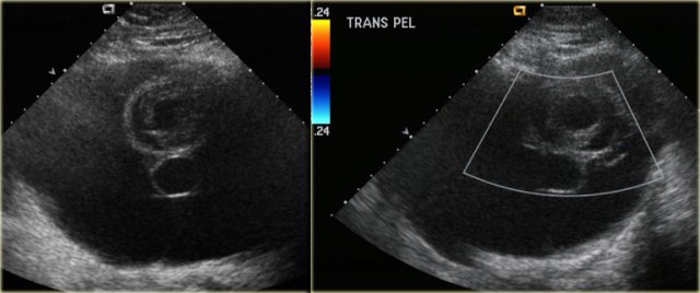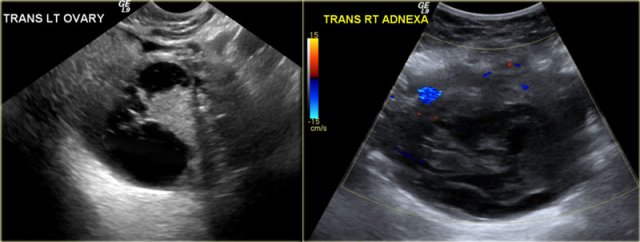 The ultrasound images show the right and left ovary: on both sides there is what appears to be a solid lesion.