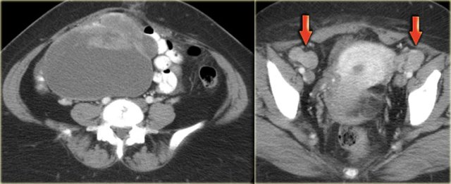 On the basis of this CT the distinction between a benign ovarian lesion such as as cystadenofibroma and a malignant ovarian lesion cannot be made.
