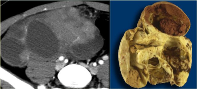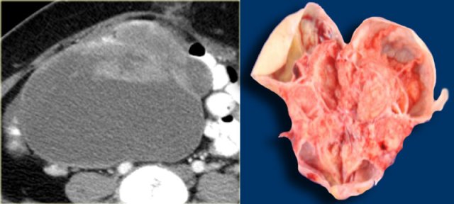 This looks like a cystic ovarian neoplasm but no ovary could be identified.