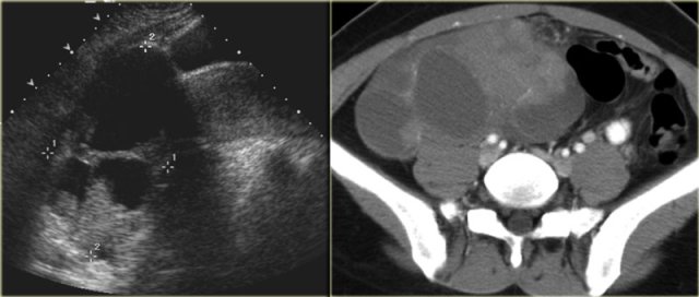Ultrasound shows a complex solid-cystic mass in the left ovary, and another, very large complex solid-cystic mass in the right hemi-pelvis.