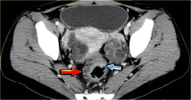 Barely visible is part of a circumferential colorectal cancer (blue arrow).