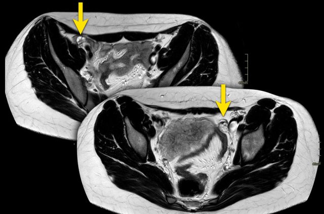 On MRI the non-developed rudimentary tissue may be present with low signal on T2WI.