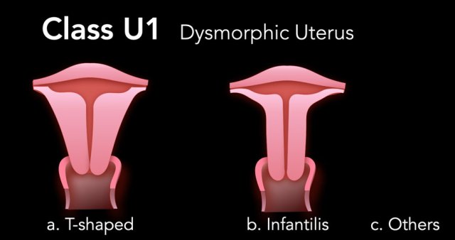 Class U1 is a dysmorphic shaped uterus either as a T-shaped cavum due to abnormally thick uterine walls or as a T-shaped cavum due to an abnormal outer contour (infantilis).
