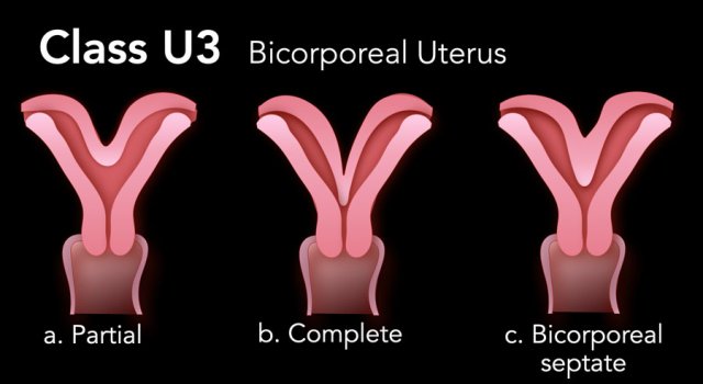 Class U3 is a bicorporeal uterus with a left and right corpus as a result of failure of fusion. The outer contour is abnormal with an external cleft of the fundus. A bicorporeal septate uterus has both an external cleft and a septum.