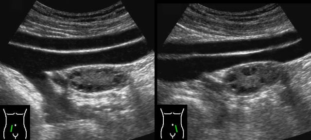 A very full bladder is unpleasant for the patient, hampers adequate compression and pushes organs away from the ventral abdominal wall, excluding the use of high frequency probes.