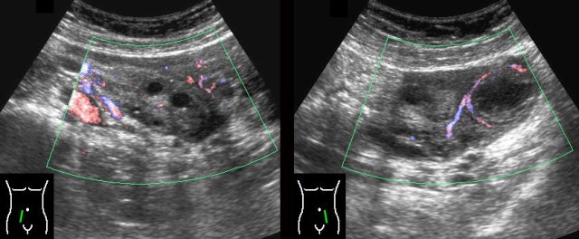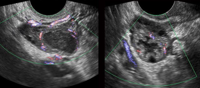 In women of the fertile age the normal inactive ovaries show moderate vascularization (left image).