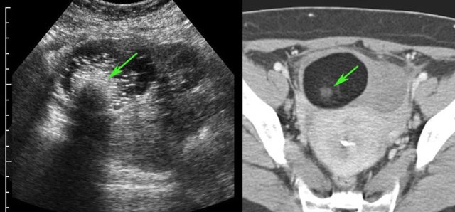 Next to clinical features and lab findings, US has an important role to differentiate these conditions from a functional cyst.