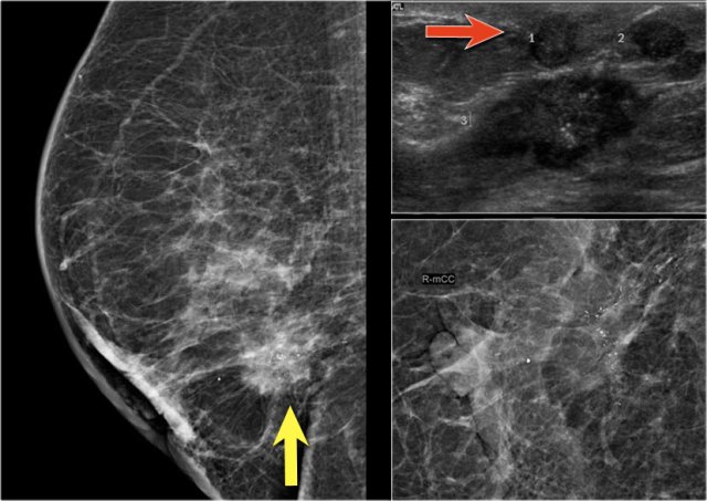A large tumor in the right breast is easily detected with BSGI, while hardly visible on the mammogram.
