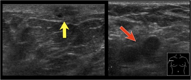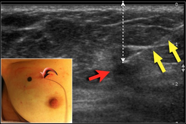 On this ultrasound image, there is another satellite nodule within the skin (yellow arrow).