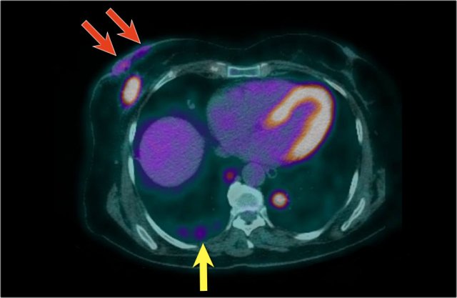 Here we see the PET-CT image of this patient. Both the breast carcinoma as well as the spread to the skin are demonstrated (red arrows). There are multiple metastases in both lungs - a metastasis in the right lung is indicated by yellow arrow; notice the larger metastasis in the left lung.