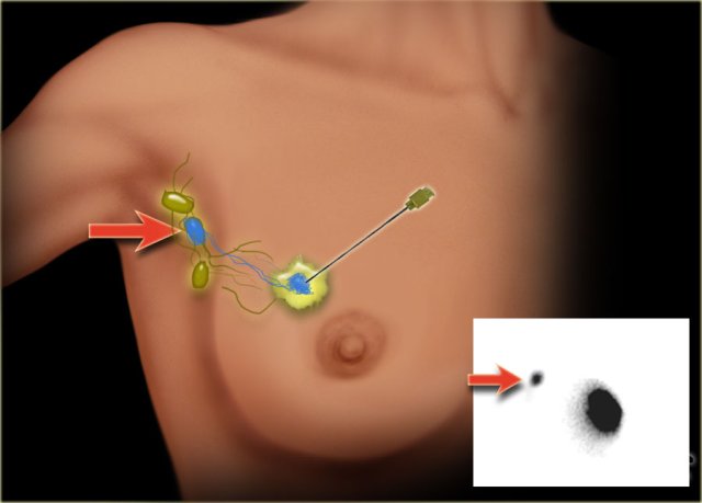 In patients who have no detectable axillary lymph node metastases with ultrasound-guided fine needle aspiration (FNA), a sentinel node procedure is performed in order to acquire information about the lymph node status of the axilla.
