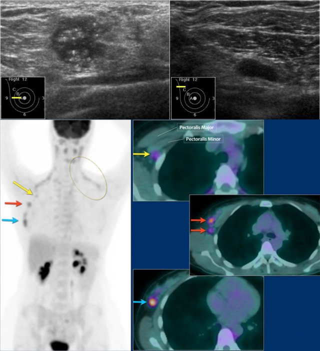 On the upper PET-CT image a level II node is positive just underneath the pectoralis minor (yellow arrow).
