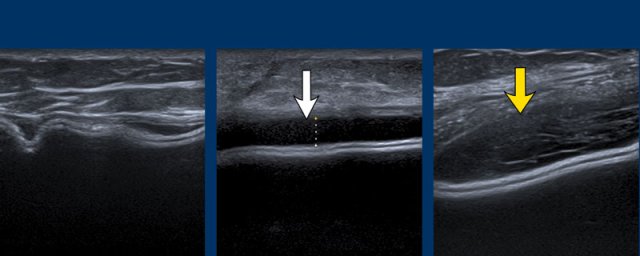 The envelope of the prosthesis can be seen as an inverted Oreo cookie. The first white line is the outer interface of the envelope and the second white line is the inner interface between the envelope and the Silicone gel (yellow arrow).