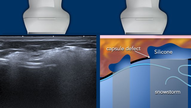 The condition of the implant can be obscured by capsular calcifications or the posterior border can be hard to see in big volume of implant.