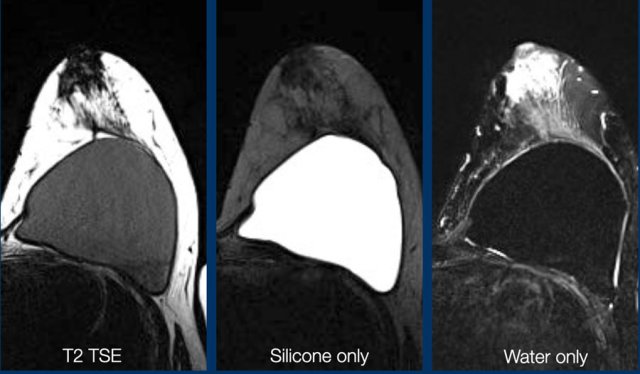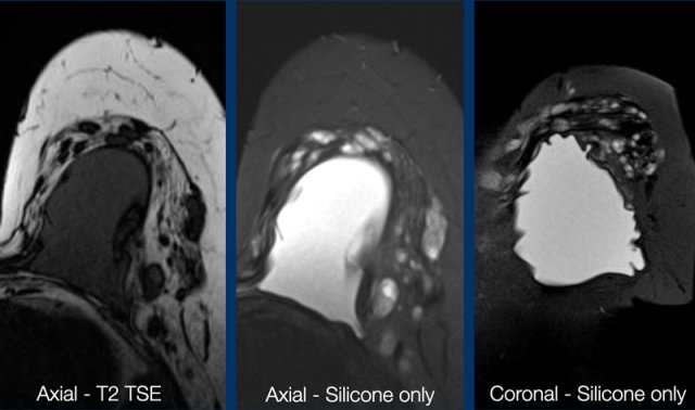 MRI of the same patient showing free silicone as areas of high signal on silicone-only sequence.