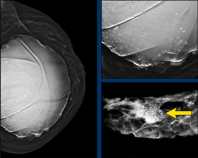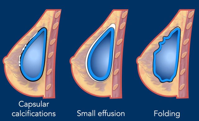 The left implant in this patient shows capsular calcifications, which are not located at the periphery and which are discontinuous.
