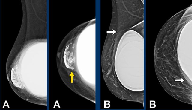 In B there is a situation after operative capsulectomy and replacing of the subpectoral breast implant.