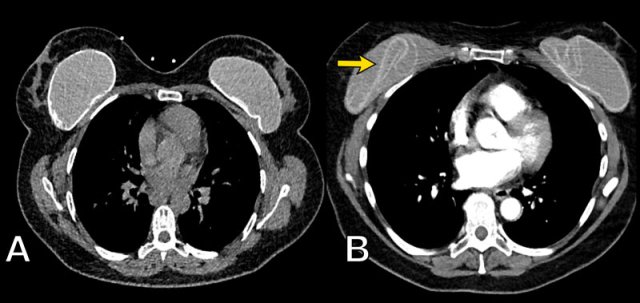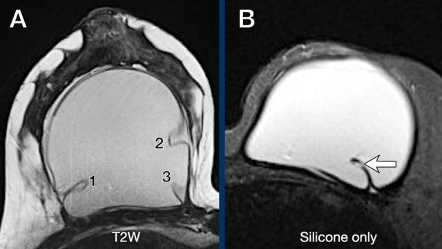This woman has an extracapsular rupture on the right with silicone outside the thickened capsule (white arrow).