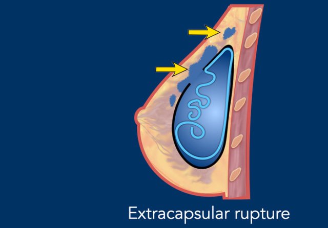 In extracapsular rupture the silicone from the ruptured implant migrates freely beyond the envelope and the fibrous capsule into the surrounding breast tissue.