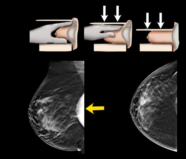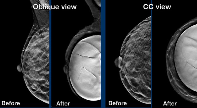 The location of the implant in relation to the pectoral muscle is best recognized on the oblique views.