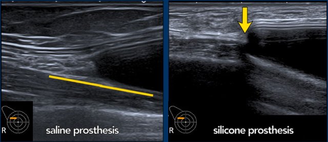 In the left breast there is an intracapsular rupture indicated by the subcapsular line with silicone on both sides of the line (yellow arrow).