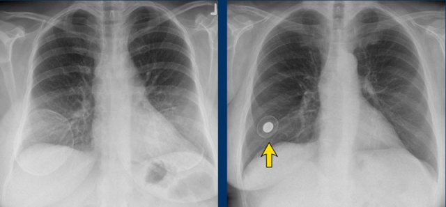 This woman has a saline filled implant and shows a discoid diaphragm, which is the fill valve.