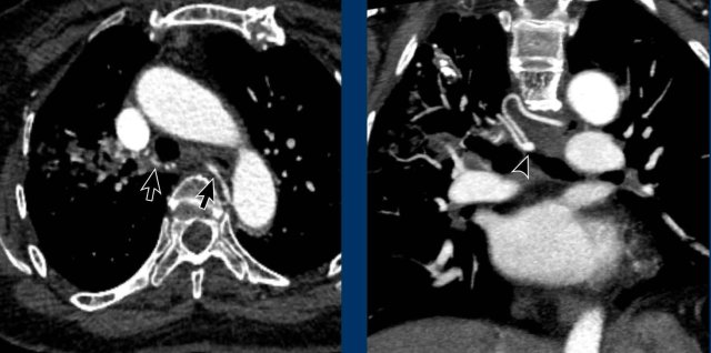 Hypertrophy of the bronchial artery up to 4 mm in diameter (arrows) with a small aneurysm (arrowhead).