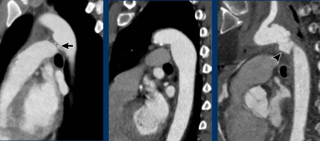 Examples of an aortic diverticulum (left), an aortic splindle (middle), and traumatic aortic injury at the level of the isthmus.