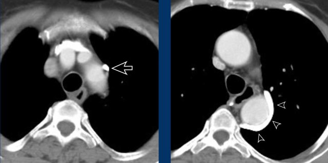 When enlarged and sufficiently opacified they may be seen on chest CT.