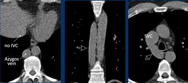 In this variant there is absence of the infrahepatic portion of the IVC with the infrarenal and renal segments draining via an enlarged azygos vein into the superior caval vein.