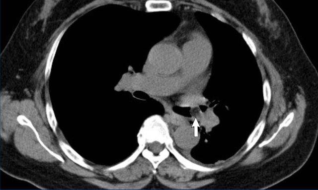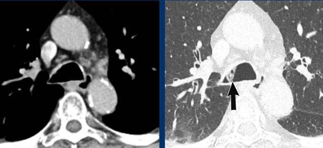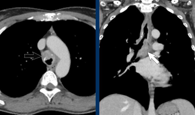 bronchus in a 28 y.o male scanned for oncology follow-up (axial image) and in a 77 y.o male scanned in trauma setting (coronal image).