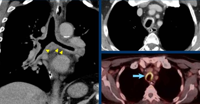 Wall thickening of the trachea bifurcation post-radiotherapy.