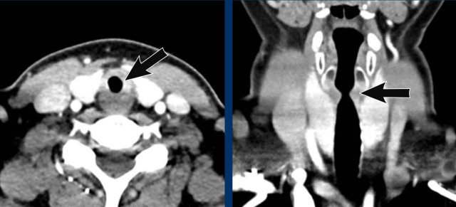 Typically, a subglottic stenosis near the thoracic inlet is seen with an hourglass shape in the coronal plane, due to a short segment of focal scarring in the trachea (figure).