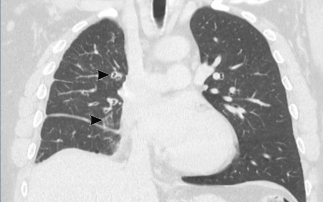 bronchus (arrowhead) in a 57 y.o female in follow-up for interstitial lung disease.