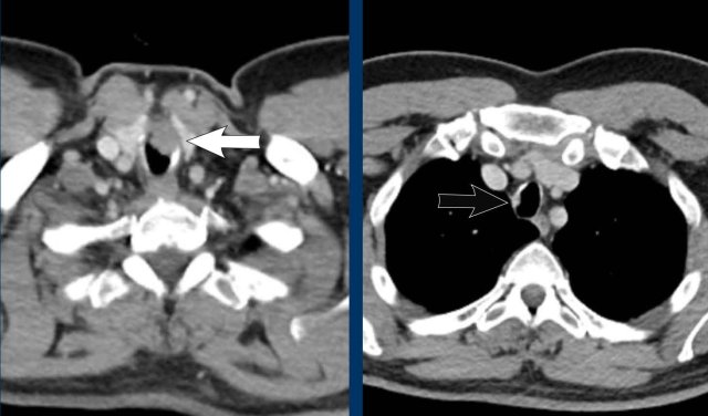The most common iatrogenic central airway pathology is focal stenosis after endotracheal intubation or tracheostomy. Focal fibrosis may occur in reaction to necrosis caused by cuff pressure or due to direct iatrogenic damage of the tracheal wall.