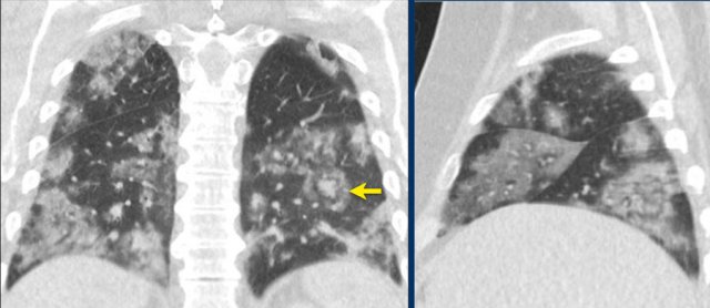CT findings: lobar consolidation and tree-in-bud (arrows) consistant with a bacterial infection, i.e. CORADS 2.
