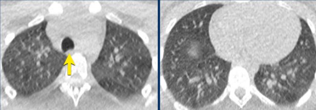 - Headcheese sign” with a mixture of lobules with ground glass, normal density parenchyma, and air trapping