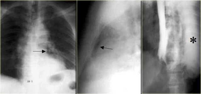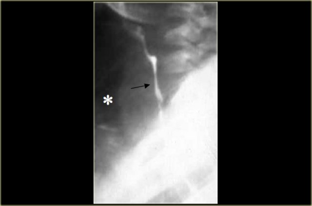 Esophagram with extravasated water soluble contrast material in left hemithorax (asterisk)